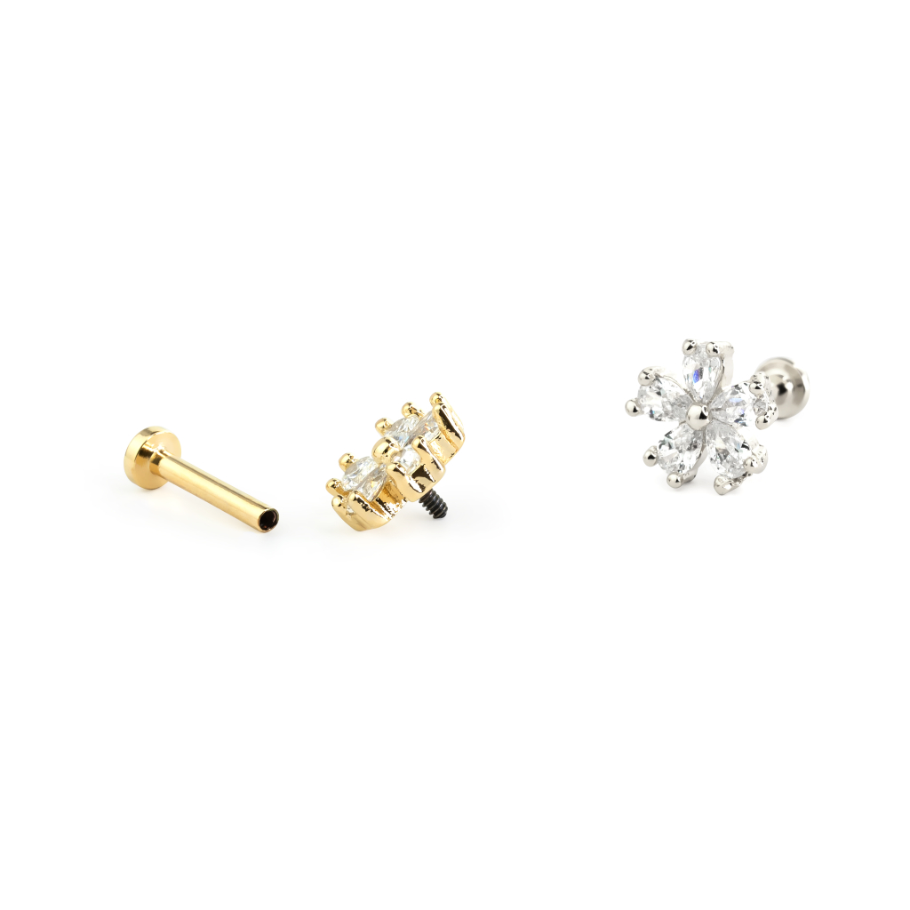Blomsten er laget av messing og belagt for å matche resten av labreten. Du kan nemlig få smykket i flere forskjellige farger og med forskjellig belegg avhengig av hva slags kombinasjon du ønsker deg. Hvis du for eksempel velger en rosegull labret - da kommer blomsten til å være i rosegull. Imidlertid vil stenene alltid være klare.