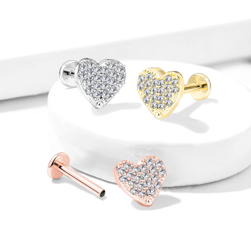 Labreten er utstyrt med ett invendig gjenge og hjertet på toppen fungerer også som en låsemekanisme. Det sitter nemlig en liten skrue på baksiden av det vakre hjertet som gjør at hjertet kan skrus ned i staven. Med denne gjengen er du også bedre beskyttet mot skar og få små sår når du setter inn smykket.
