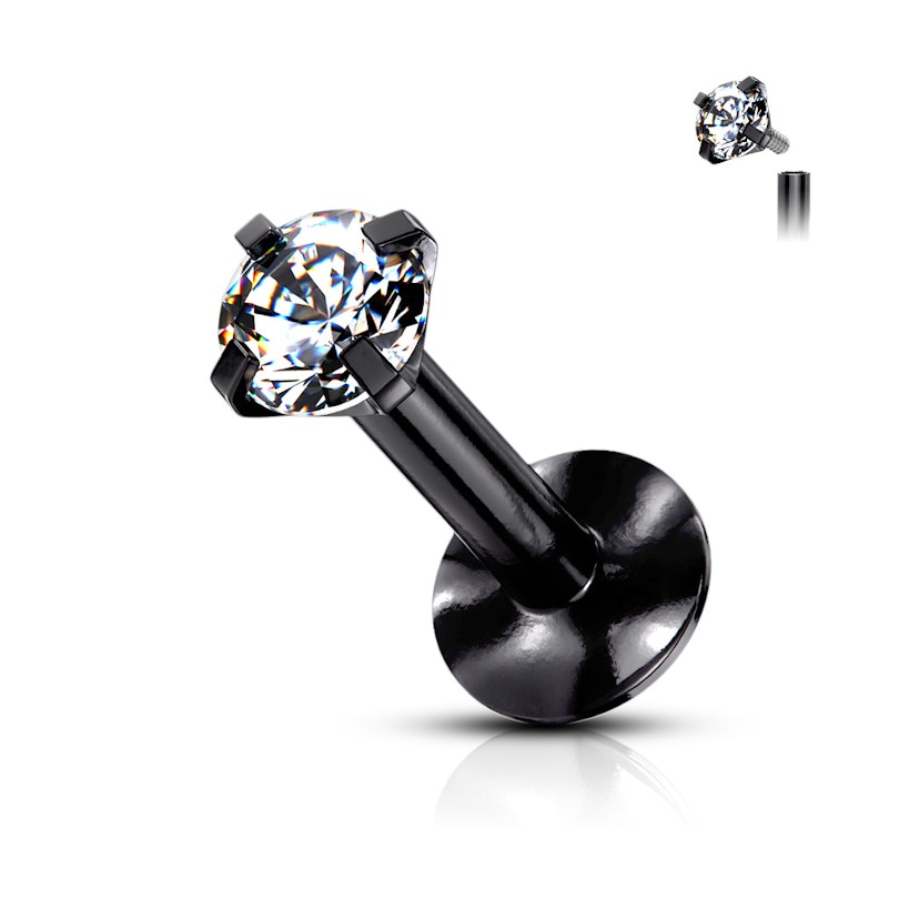 Labretten i de fem fargene har en enkel klar sten i toppen og stenen vil være klar, uansett hvilken farge du velger labretten i. Stenen holdes på plass av fire små armer som er formet direkte ut av stålet, så den sitter riktig godt fast. Du behøver altså ikke frykte at den ryker av i bruk eller hvis den blir våt, akkurat fordiden ikke bare er limt fast.