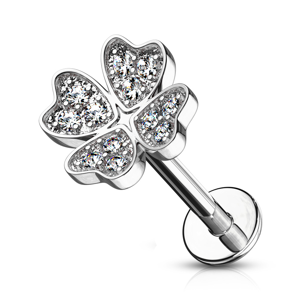 Labret med stenbesatt firkløver og innvendig gjenge