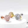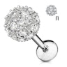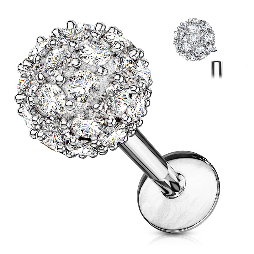 Smykket her er nemlig utstyrt med en stor kule på hele 6 mm. i diameter. Over alt på kulen sitter det små klare stener og glimter så snart lyset treffer dem - dermed kan denne labreten også fange en hel del oppmerksomhet hvis det er det man ønsker. Staven på smykket er laget av kirurgisk stål og kulen er laget av messing. Kulen er også belagt med forskjellige farger for å gi deg muligheten til å velge den som passer deg best. Velger du for eksempel en gull-variant av smykket, så er den belagt med 14 karat gull.