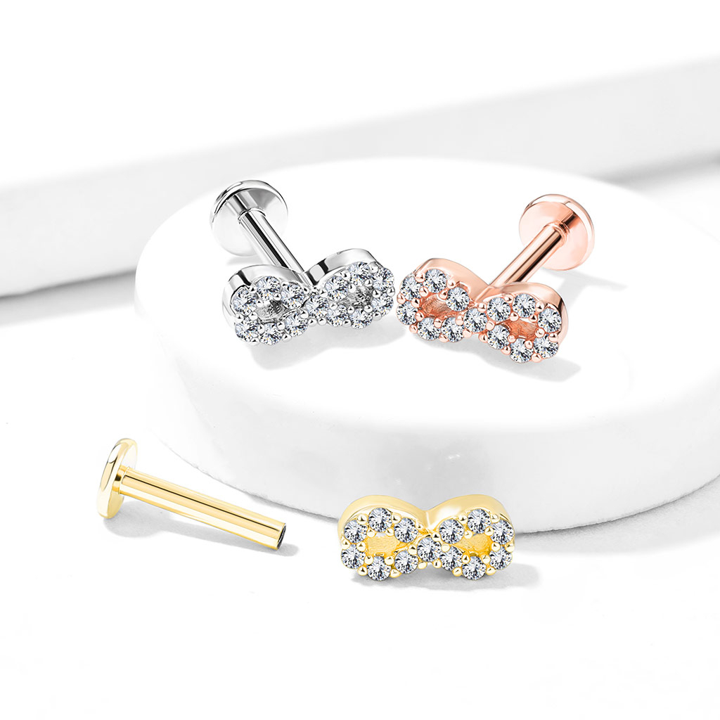 Den nevnte designen på toppen er et vakkert evighetssymbol som er besatt med mange små klare stener. På baksiden av evighetssymbolet er en liten skrue som er skrudd inn i tråden på labretten. Derfor fungerer designen også som låsemekanismen.