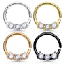Smykker til septum er ofte store og prangende, med mindre man bruker en vanlig kulering eller segmentring. Så snart det er sten innblandet blir de store og voluminøse. Det er dog ikke tilfellet med denne septumpiercingen, som med sitt lille spinkle design allikevel har fått tre små stener plantet midt på den lille ringen.