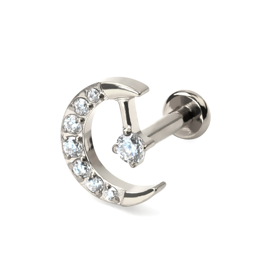 Denne lekre labreten har en halvmåne innfattet med små CZ-stener og en større sten som pryder toppen av månen. Smykket er gjenget innvendig, slik at du enkelt kan sette inn den glatte staven i piercingen din og deretter skru toppdelen for å sikre den på plass.