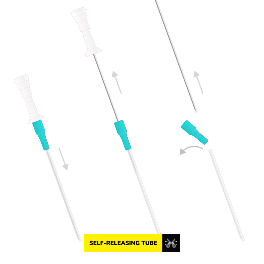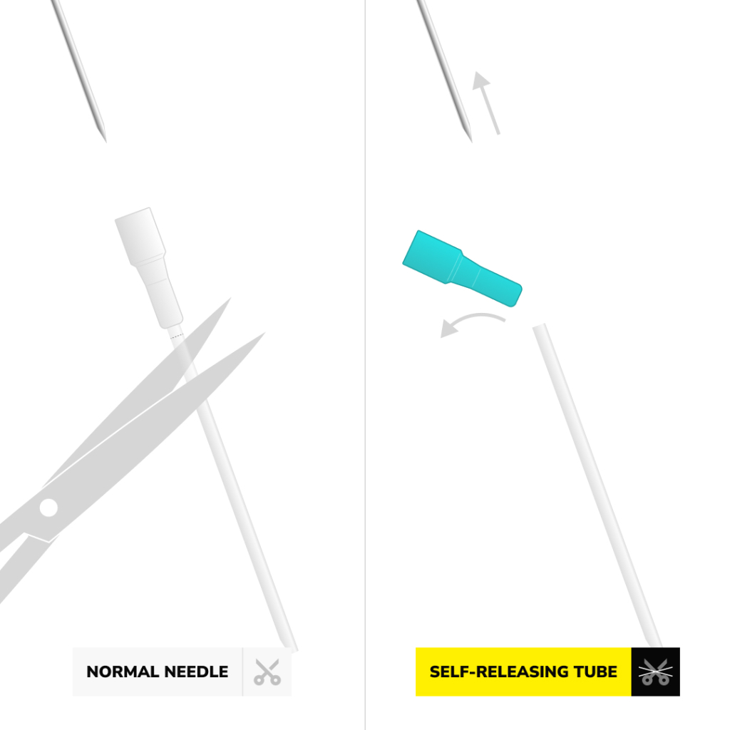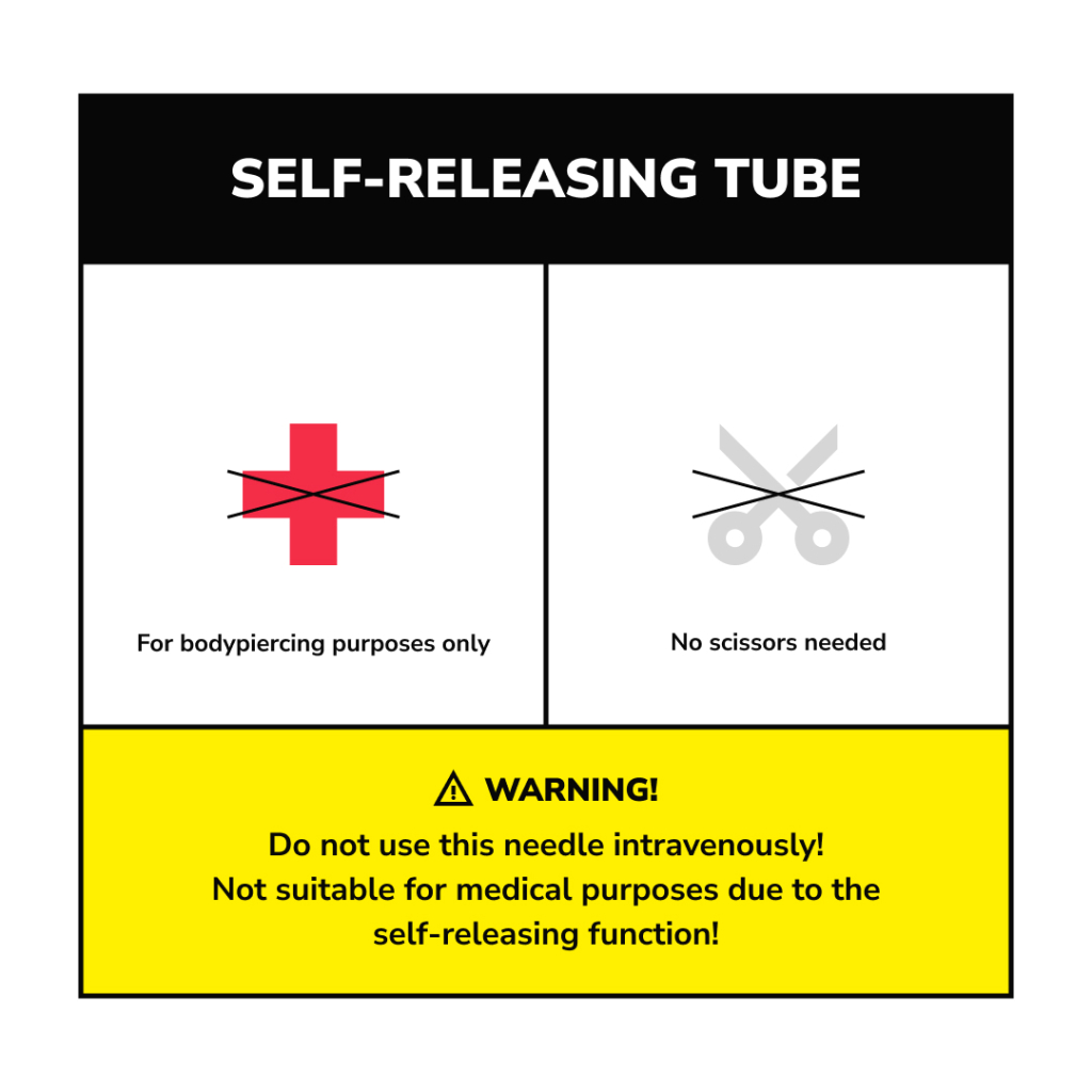 Mosquito-nålene er svært skarpe og EO -gass steriliserte. Det er 50 nåler i en eske som hver og en har blitt steriliesert individuelt. Hver nål er utstyrt med et kateter. Det smarte med denne modellen er at du ikke lenger trenger å bruke saks for å klippe kateteret. Nålen er utstyrt med en selvutløsende funksjon, noe som betyr at den fargede delen av kateteret faller av når nålen trekkes tilbake etter at piercingen har blitt utført. På den måten er det bare kateteret igjen i kroppen - klar til at smykket kan tres gjennom hullet.
