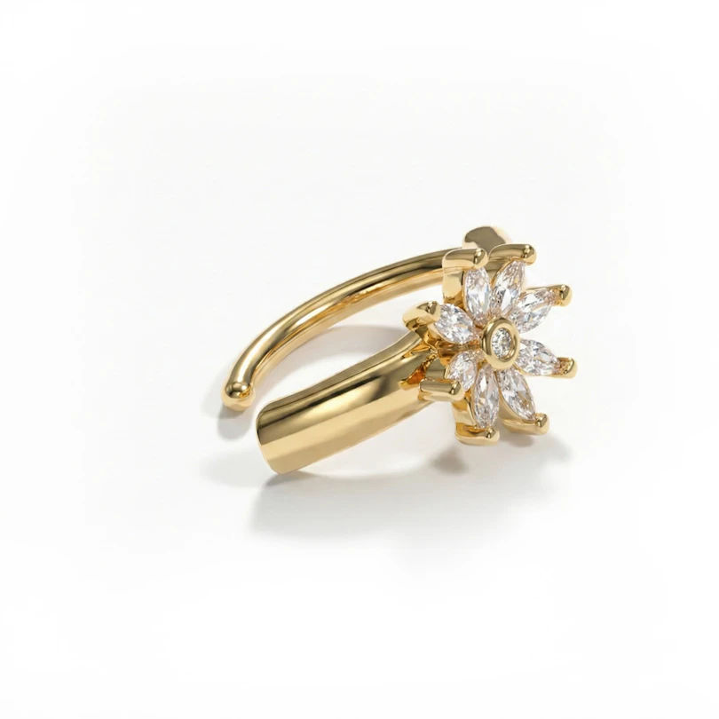 Denne stilige navleclickeren er utstyrt med en glitrende blomst i midten. Blomsten består av 9 cubic zirconiastener. Smykket er tilgjengelig med gull– eller sølvfinish.