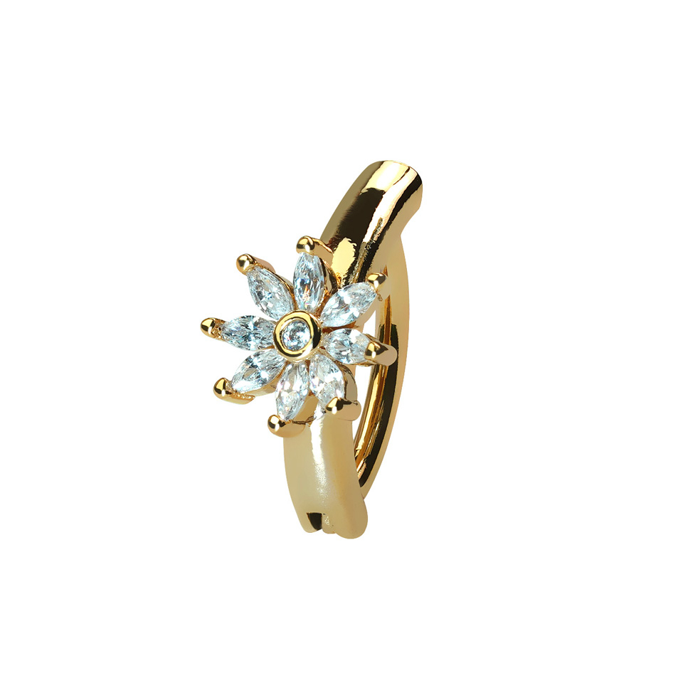 Denne stilige navleclickeren er utstyrt med en glitrende blomst i midten. Blomsten består av 9 cubic zirconia-stener. Smykket er tilgjengelig med gull– eller sølvfinish.