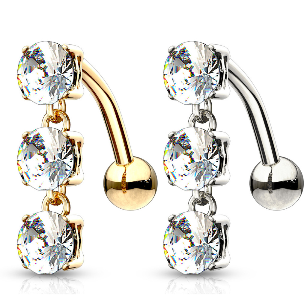 Navn: Navlepiercing av 14 karat gull med omvendt anheng og tre stener