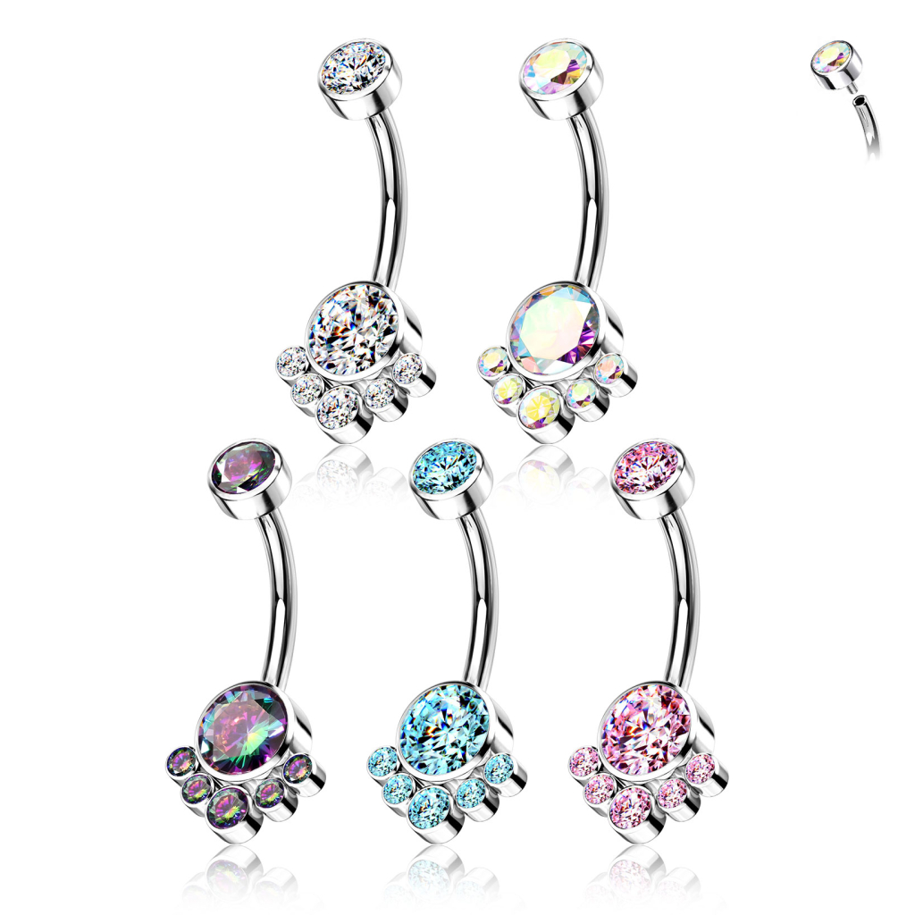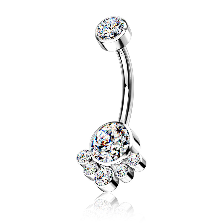 Det du ser på her topper alt. Du får alle de gode egenskapene som finnes i piercingsmykker. Du får et kvalitetsmykke av titan som er et utmerket materiale. Du får en innvendig gjenge som beskytter navlen når du setter inn smykkene. Og sist men ikke minst får du mange stener, som med sine overflater gjengir lyset på den beste måten.