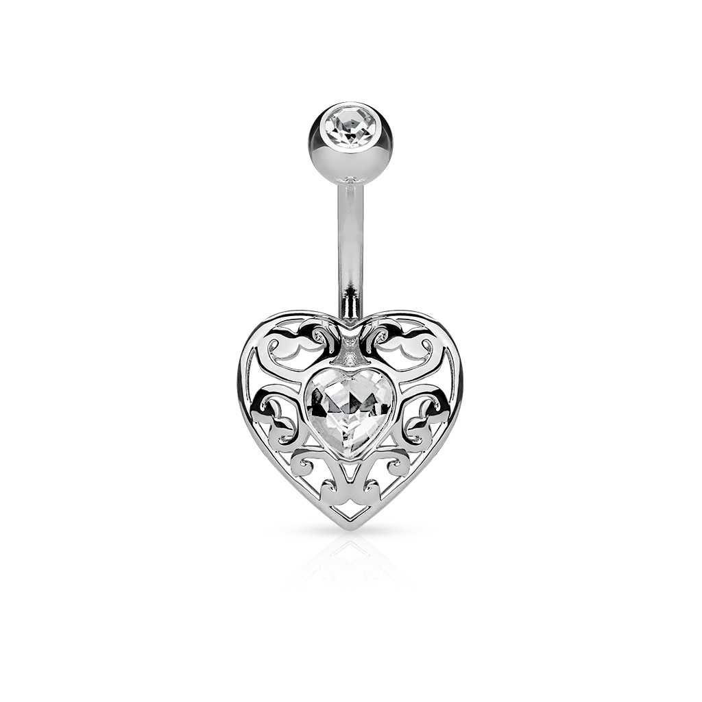Smykkehjertet er integrert i en detaljert filigrandesign, noe som gir smykket litt dybde og gjør at det ser mye mer elegant ut. I tillegg har navlepiercingen en trådtykkelse på 1,2 mm. og en total lengde på 25 mm. - som ikke er veldig stort, men likevel gjør det til et vakkert og elegant smykke, som kanskje er litt mer diskret.