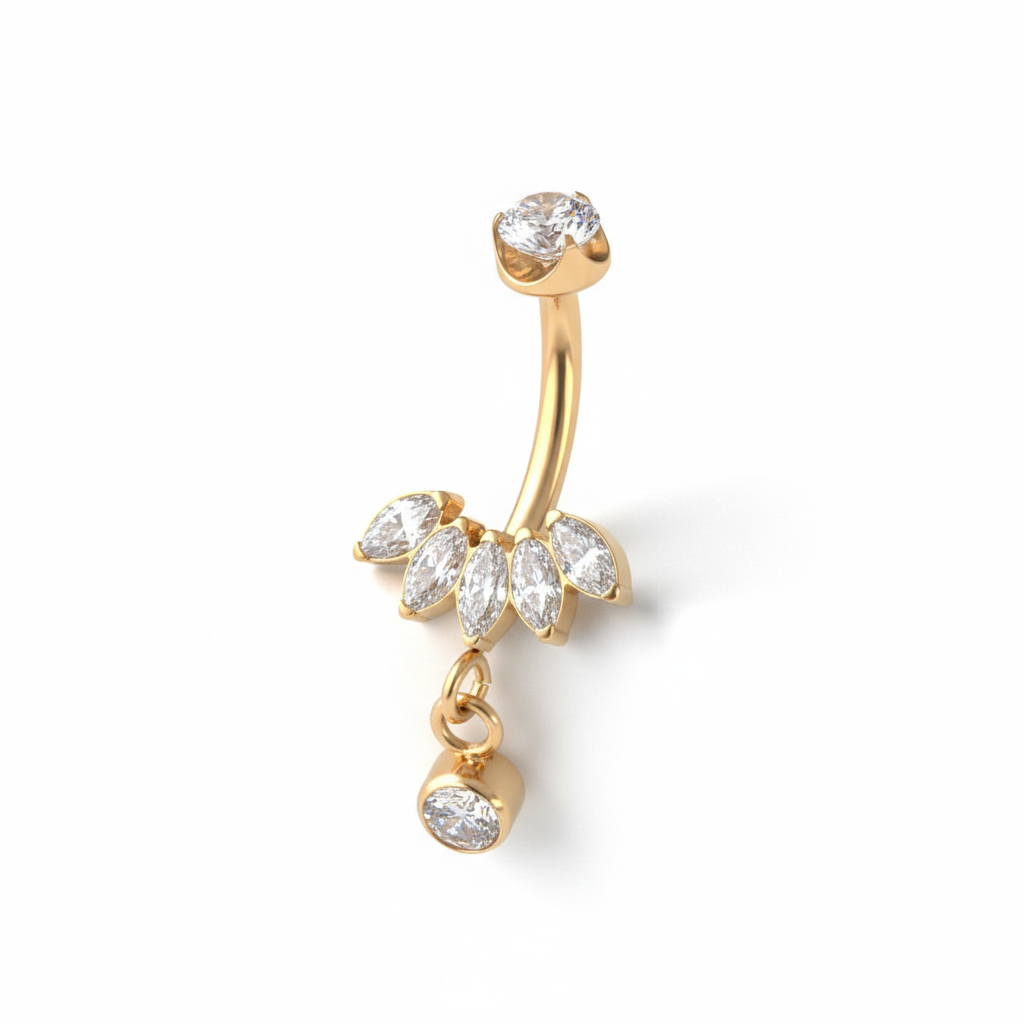 Og designet? En klynge av glitrende marquiseslipte stener som pryder navlen, avrundet med et delikat anheng som fanger lyset når du beveger deg. Smykket kommer i både sølv og gull, og du kan selv gå for den som passer stilen din best. Den innvendige gjengen gjør den brukervennlig, men vi anbefaler å bruke den med måte på grunn av designet.