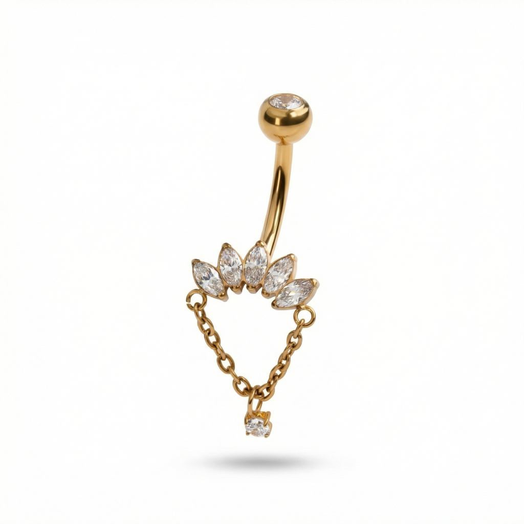 Denne navlepiercingen i titan med marquisestener og kjedeanheng er ikke bare en alminnelig titanbarbell - det er et smykke med personlighet. De marquiseslipte stenene sitter som en liten krone, mens kjedeanhenget gir litt drama (fordi piercinger fortjener å være i rampelyset de også).