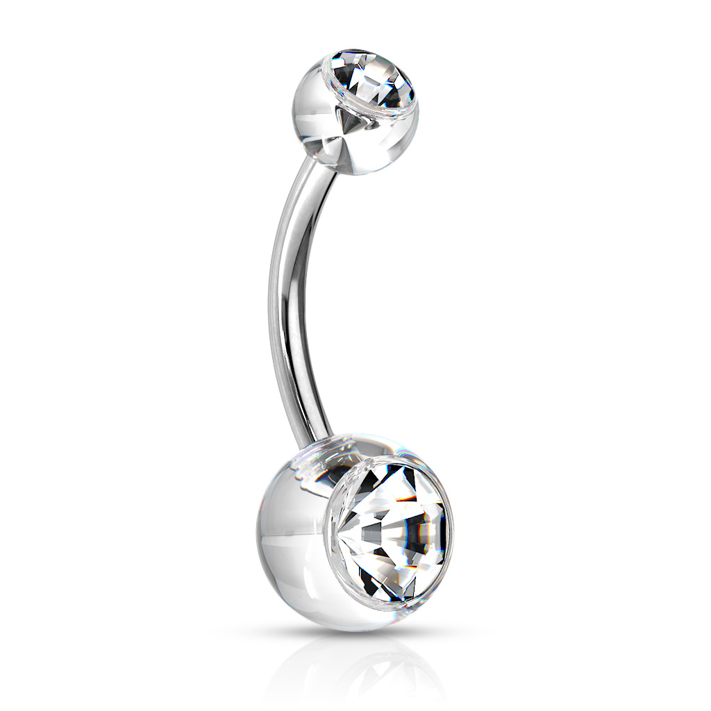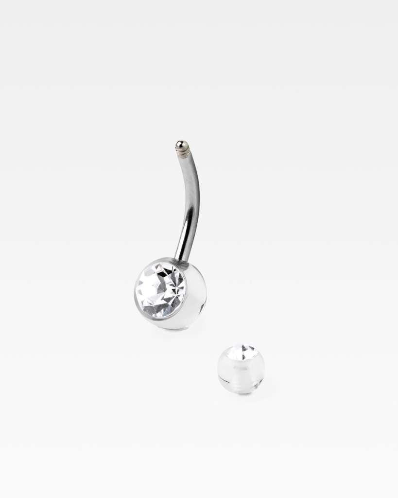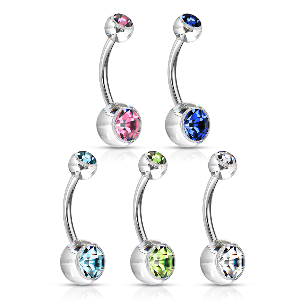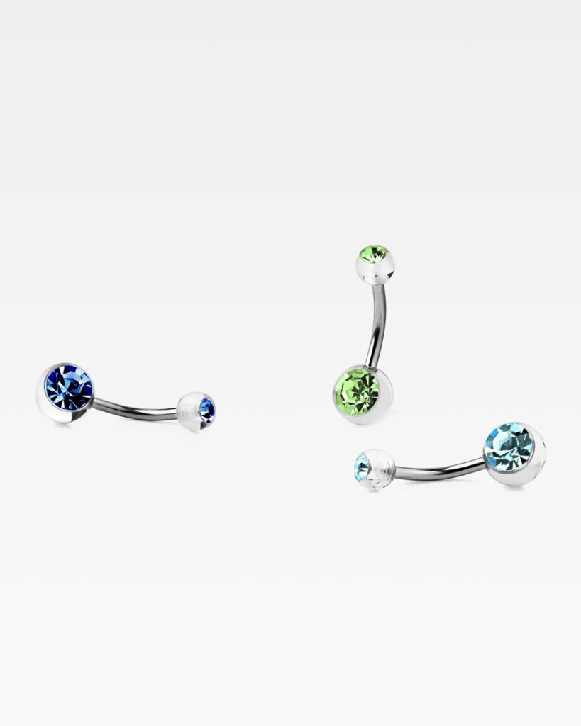 Her har du et lekkert lite dagligdagssmykke som både er flott og enkelt mens man samtidig får utrolig mye for pengene. Navlepiercingen her har en stav av kirurgisk stål og topp- samt bunnkule av akryl. Begge kulene har en fin sten som kan velges i fem forskjellige farger. Du kan velge den klare varianten som nok er det mest klassiske look, eller du kan være litt mer vågal og velge en av de mer bemerkelsesverdige fargene som alle står i flott kontrast til huden.