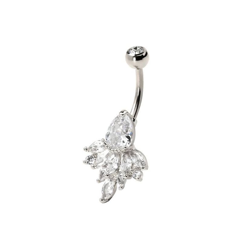 Denne navlepiercingen er ved første øyekast helt alminnelig. En buet stav på ca. 10 mm. og en toppkule med klar sten. Kikker man dog nærmere på smykket vil man se at den velkjente runde bunnkulen er skiftet ut med en dråpeformet sten. Under denne dråpen er det en hel klynge av enda flere stener, som også er dråpeformede men også avlange - Nærmere betegnet marquise-slipt. Under dråpestenen sitter fem marquise-slipte stener og under dem sitter enda fire dråpeformede stener - Én mellom hver av de avlange. Det ekstravagante smykket avsluttes til slutt med en avlang sten i bunnen.