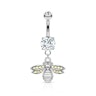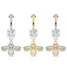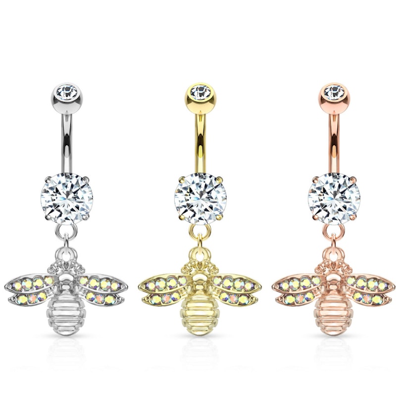 Navlepiercingen du ser over har en søt liten bie hengende i anhenget. Bien er laget av messing og har montert på hver vinge et antall små stener som inneholder de fleste av regnbuens farger - Vi kaller det aurora boeralis, da den også kan minne om nordlyset. Bien henger på en stav som er 10 mm. lang og 1,6 mm. tykk. Den er laget av kirurgisk stål som de fleste andre navlepiercinger du finner her.
