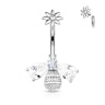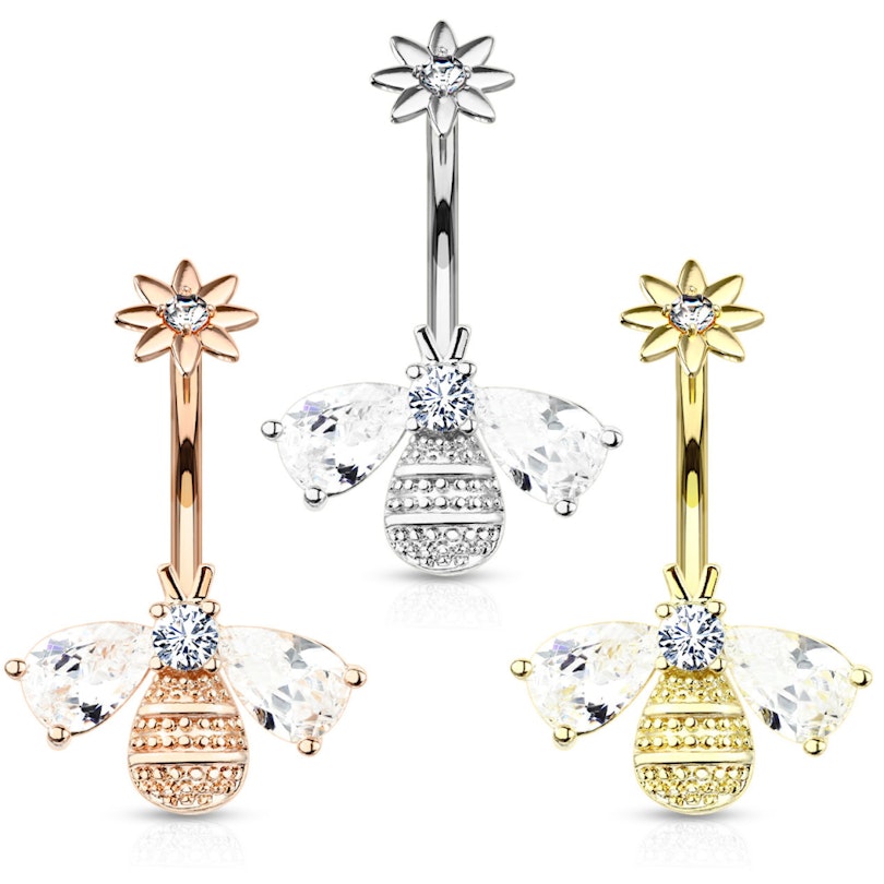 En navlepiercing trenger ikke alltid å bestå av en vanlig rund toppkule og en litt større bunnkule. Du kan som i dette tilfellet være litt mer kreativ og gjøre noe ekstra ut av designet. Toppen har ikke bare en innvendig gjeng, den er også utstyrt med en blomsterformet lukkekule med en liten sten i sentrum. Blomsten skrues løs fra 10 mm. lange staven, der det på slutten er en liten bie med noen vakre stenvinger. Biehodet er også laget av sten. Den lette kroppen har laget noen få detaljer der for det generelle utseendet mer naturtro.