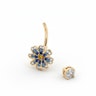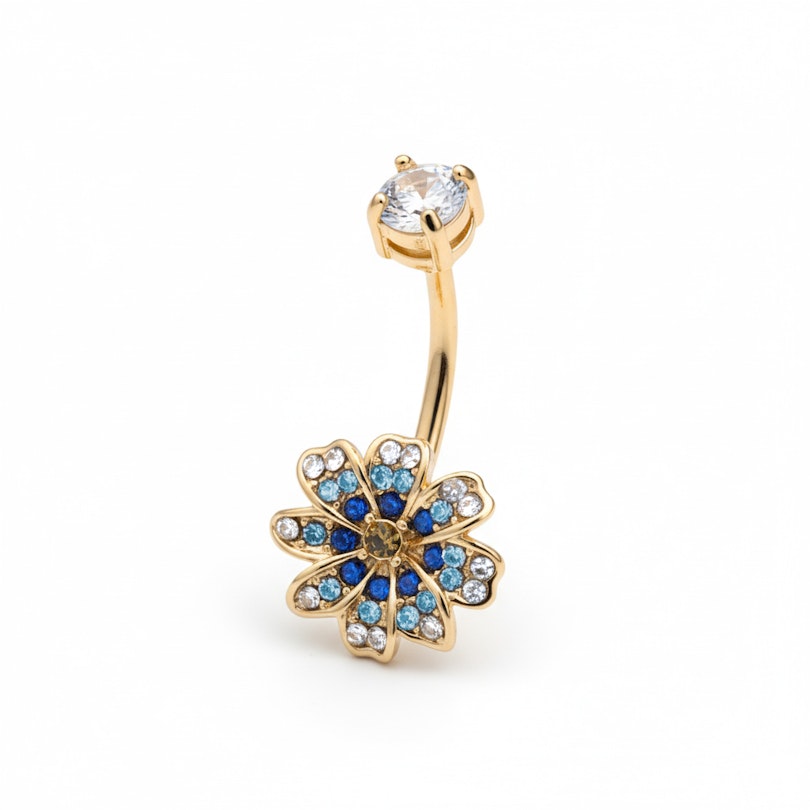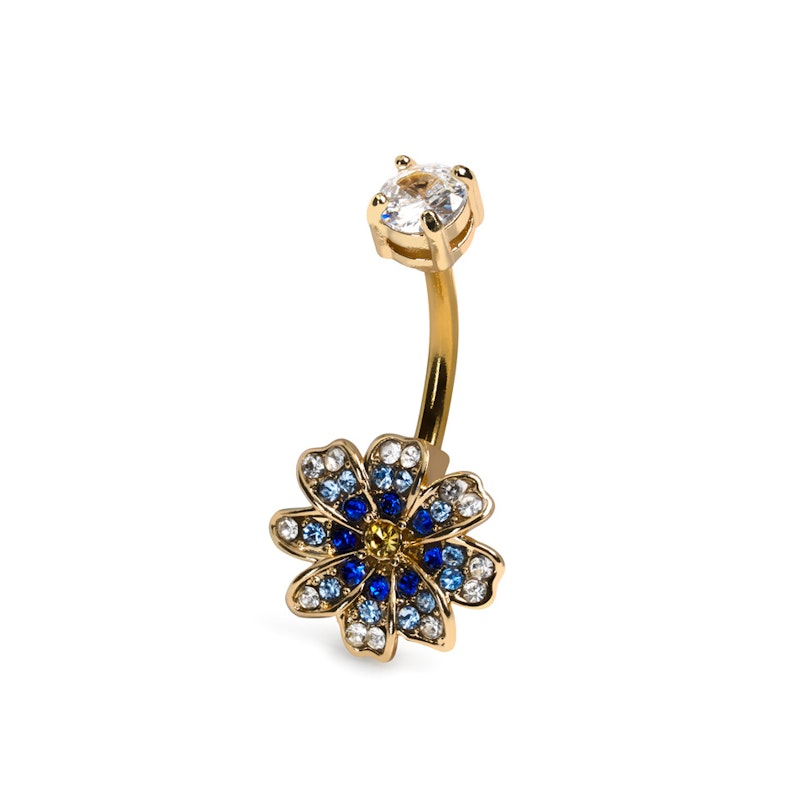 Denne søte navlepiercingen er laget for crop-top-sesongen. Den har en blomst laget av små stener i ulike blå nyanser med en gul stein i midten. Den øverste kulen har en blå sten.