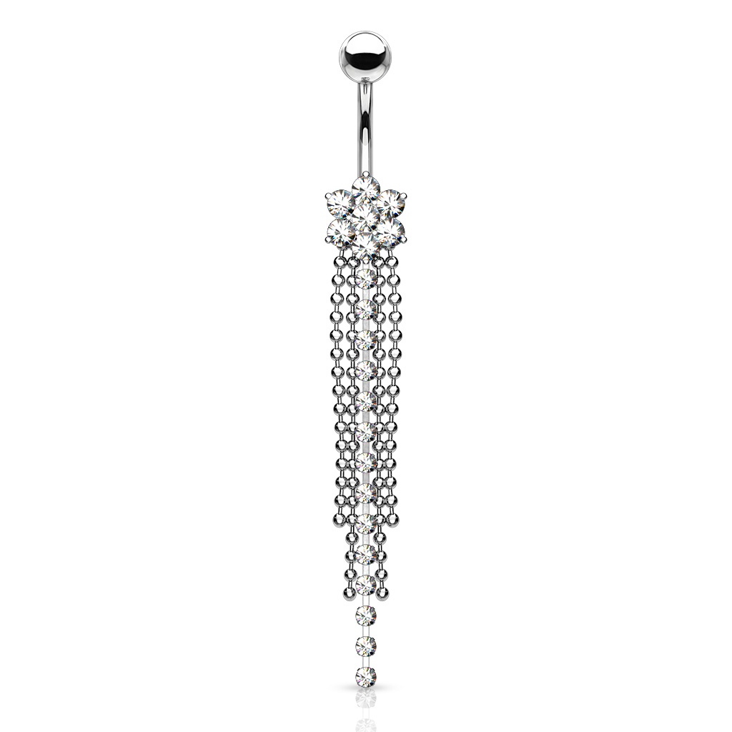 Med dette smykket får du på alle tenkelige måter en helt utrolig vakker og elegant navle. Uten å "være for mye" blir din navle pyntet med stener i både bunnkulen, som er formet som en blomst, samt i det midterste kjedet i anhenget. Blomsten som utgjør bunnkulen er laget av 7 små seperate stener, som hver enkelt blir holdt på plass av små gripearmer og som til sammen danner den perfekte blomsten.