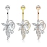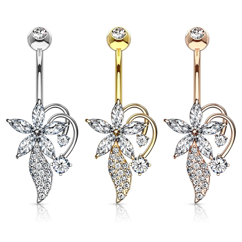 Denne navlepiercingen består i all sin enkelhet av en buet stav med en låsekule i toppen og en dekorativ blomst med ranker i bunnen. Navlepiercingen har sstandard piercingmål, som er 1,6 mm i tykkelsen og 10 mm i lengden. Staven og kulen er laget av kirurgisk stål og resten av messing. Begge deler er etterbelagt med henholdsvis bladgull og rhodium. Rhodium gir en flott sølvblank overflate.