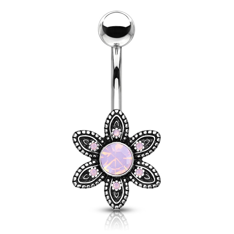 Navn: Navlepiercing med blomst og runde stener av opalitt
