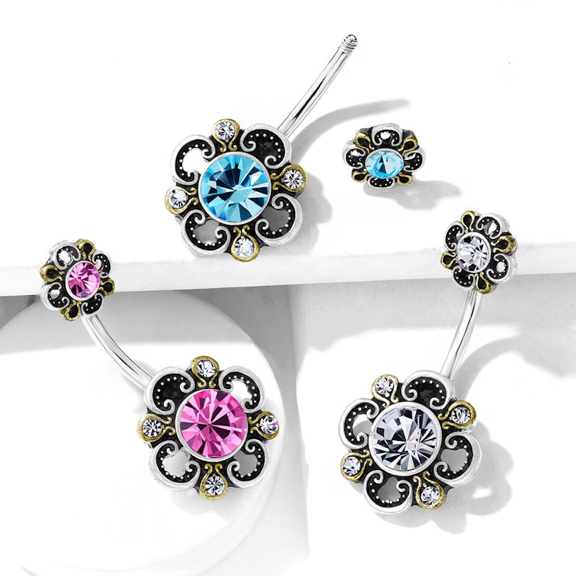 Smykket her har flere stener festet på designet i bunnen og toppen av staven. Den store midterste stenen i topp- og bunnkulen kan du velge farge på - du kan velge blant andre rosa steiner til denne navlepiercingen. Det er også fire små runde stener i hvert hjørne av blomsten nederst. Disse stenene vil alltid være klare uansett hvilken farge du velger på de andre stenene. Men det er sørget for at de klare stenene alltid vil samsvare med den stenfargen du velger.