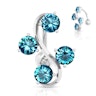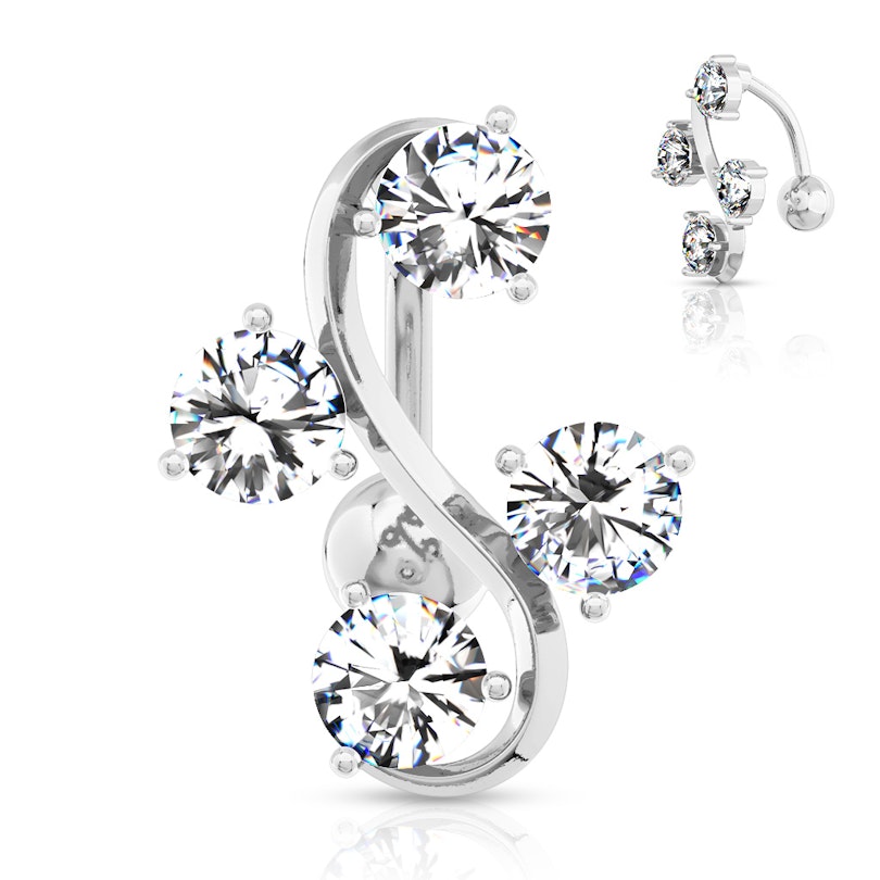 Frisk og finurlig navlepiercing med fire runde stener som sitter forskyvd rundt omkring på en stor "S" form. Det ser utrolig flott ut fordi det gir noe luft mellom stenene hvor huden så kan ses. Materialet er av kirurgisk stål som er et av de mest brukte materialer til piercingsmykker da det ikke avgir nikkel og dessuten er et utrolig hårdfør materiale.