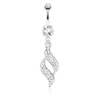 Smykket er laget av ren kirurgisk stål som er et utrolig slitesterkt samt prisvennlig materiale. Det brukes av samme grunn også til piercingsmykker i ekstra stor stil. Staven er utstyrt med en 5 mm. toppkule samt en 8 mm. bunnkule som begge er dekorert med en flott klar sten som matcher perfekt til de mange små stenene i de to flammene. Hvis du gjerne vil sikre deg en ekstra toppkule som reservedel, kan du bestille en ekstra kule med når du kjøper den flotte navlepiercingen med flammeanheng.