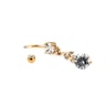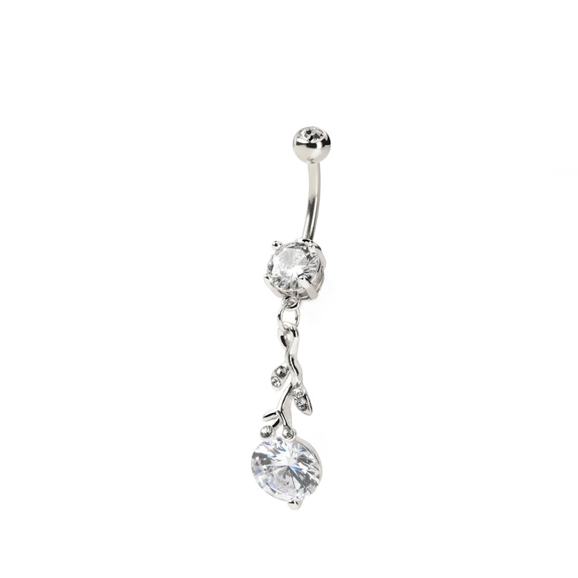 Piercingsmykker tar seg alltid best ut når de ser litt mer levende ut. Det kan særlig sies for denne navlepiercingen, som du også kan se på bildet over denne teksten. Smykket har nemlig fått påsatt et anheng, som er blitt formet til å ligne en gren med blader. De vridde grenene og flotte bladene bringer virkelig smykket til live. I bunnen av anhenget sitter det en stor kubisk zirkonia sten - utover denne stenen sitter det også en innfattet sten i toppkulen, en stor rund sten i bunnkulen samt små klare stener på bladene i anhenget. Stenene i bunnkulen og i bunnen av anhenget sitter fast ved hjelp av bittesmå fangarmer som holder stenen fast og forsikrer at den ikke faller ut.
