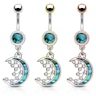 På bildet ovenfor ser du en av de litt mer mystiske navlepiercinger. Smykket er fullt av meningsfull symbolikk fra forskjellig tro rundt omkring i verden. På smykket henger det en halvmåne med noen stjerner. En halvmåne står f.eks i den keltiske tro for vekst og kreativitet. Månen, såvel som bunnkulen er dekorert med perlemor, som skal sies å ha en beroligende effekt på den som bærer det. Perlemor er et naturmateriale, som kommer fra det indre laget på en musling - dette materialet blir ofte brukt i forbinnelse med smykkefremstilling.