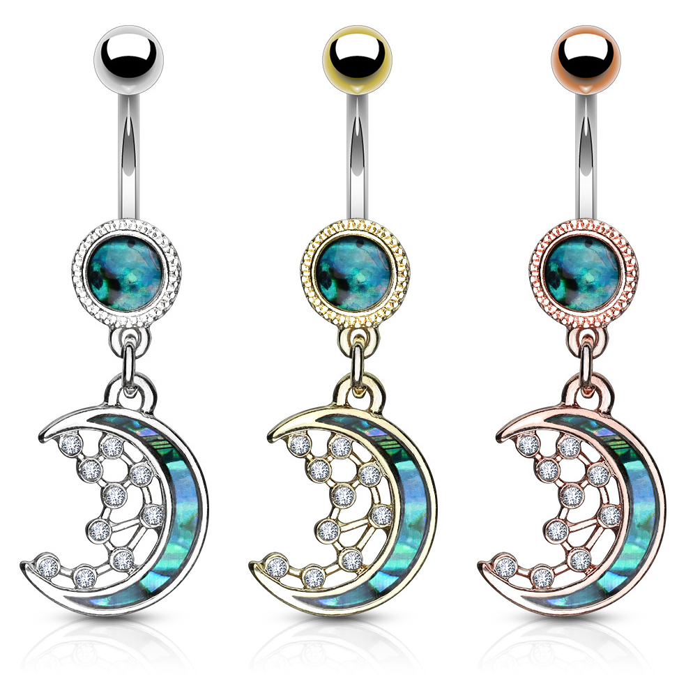 På bildet ovenfor ser du en av de litt mer mystiske navlepiercinger. Smykket er fullt av meningsfull symbolikk fra forskjellig tro rundt omkring i verden. På smykket henger det en halvmåne med noen stjerner. En halvmåne står f.eks i den keltiske tro for vekst og kreativitet. Månen, såvel som bunnkulen er dekorert med perlemor, som skal sies å ha en beroligende effekt på den som bærer det. Perlemor er et naturmateriale, som kommer fra det indre laget på en musling - dette materialet blir ofte brukt i forbinnelse med smykkefremstilling.