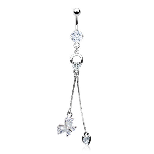 En virkelig utsøkt navlepiercing med lange kjeder og vakre motiver av klare stener. Anhenget som er utrolig gjennomført i sitt design, starter med en liten ring som er dekorert med et hjerte av klare stener nederst. Under dette hjertet sitter det enda en ring som de to lange kjedene er hektet fast på, uavhengig av hverandre. Kjedene sitter altså ikke sammen og kan derfor begge bevege seg fritt i takt med din kropps bevegelser.