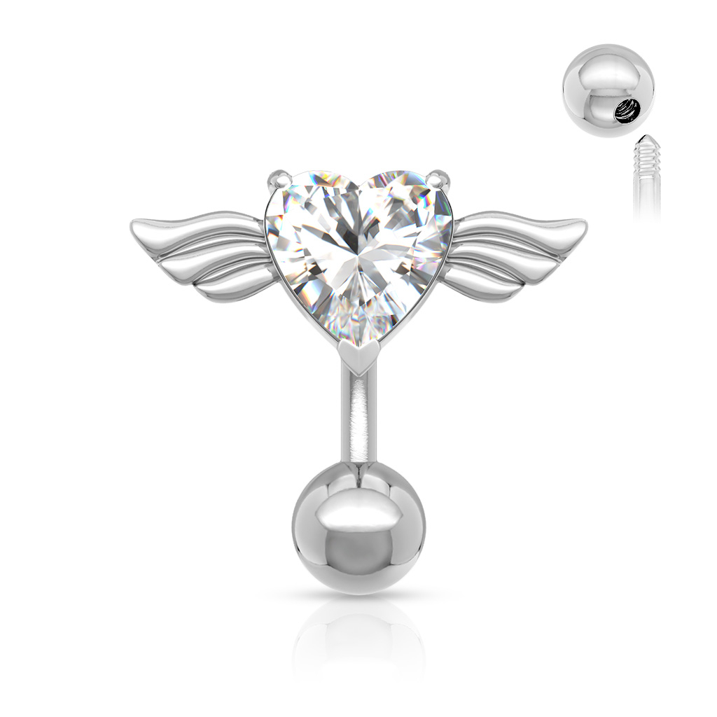Nå kan du få det flotte motivet som mange kjenner som et av de mest populære tatoveringsmotiver, som navlepiercing. Det er det velkjente lille hjertet med vinger på hver side det er snakk om. Selve smykket er laget av kirurgisk stål som er det mest brukte materialer til piercingsmykker, fordi det ikke frigir nikkel. Hjertet består av en flott facettskåret sten, som du selv kan velge i en av de tre flotte fargene.