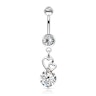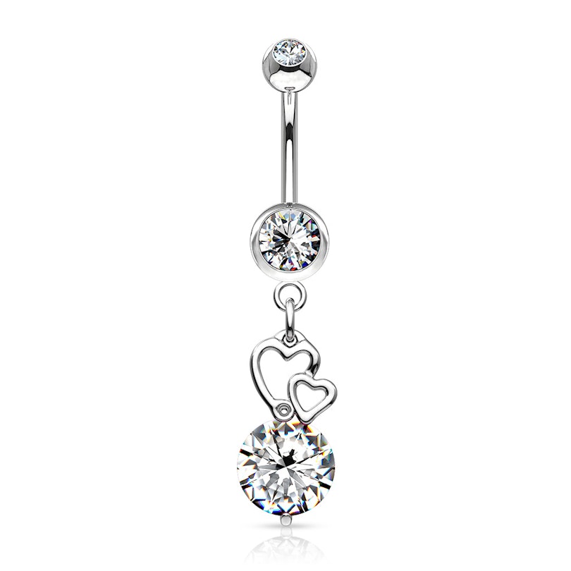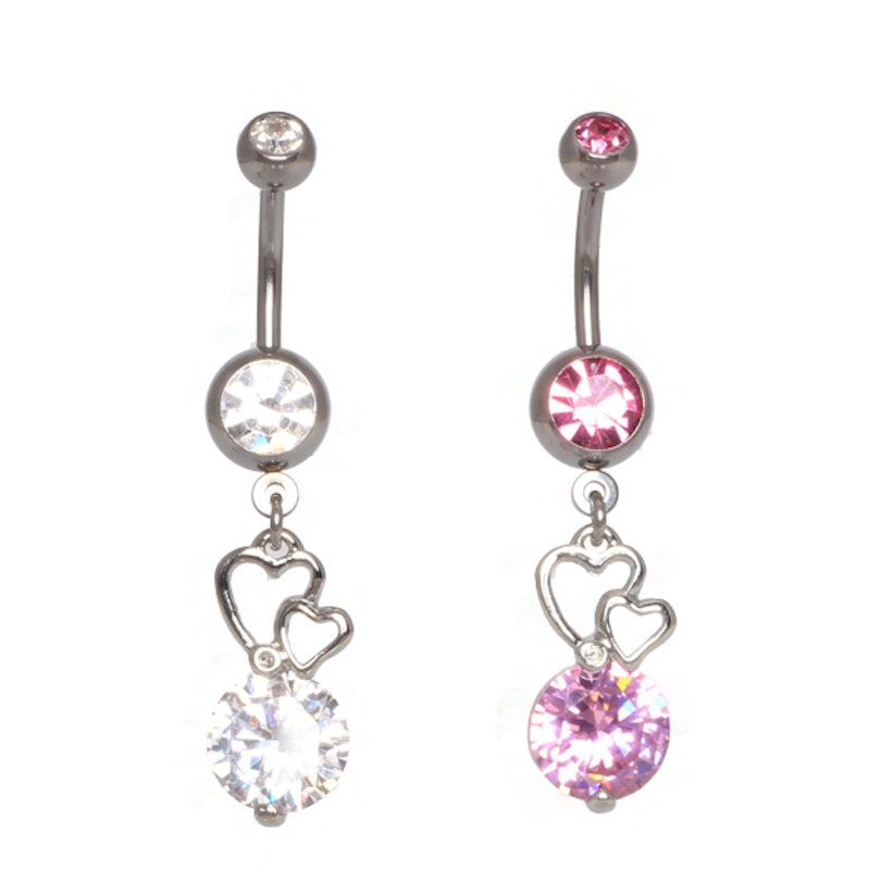 Uansett hvilken farge du velger, får du en fin navlepiercing med to søte hjerter i anhenget, to kuler med sten i selve navlesmykket og en stor sten i bunnen av det søte anhenget.