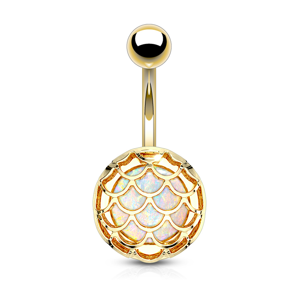 Opaler er helt nydelige, ikke minst fordi de har et fantastisk fargespill. Med denne navlepiercingen, som du kan se på bildet lengre opp, får du nettopp en opal i ditt smykke - i dette tilfellet en innkapslet opal. Stenen sitter nemlig bak en form for gitter som ligner fiskeskjell. Men du kan tydelig se opalen bak gitteret, siden den skinner gjennom når lyset treffer den. Legg dog merke til at det er snakk om en syntetisk opal, selv om dette absolutt ikke går ut over hvor vakker den er - men det hjelper en hel del på prisen.