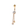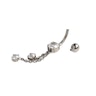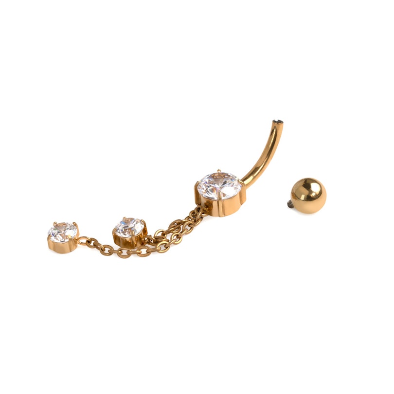 Ikke alle navlepiercinger er laget for å skille seg ut, men denne navlepiercingen i titan med kjeder og stener gjør nettopp det. Den består av en slank titanbarbell med en glitrende stener, komplettert med to fine kjeder som henger ned og fanger lyset ved hver bevegelse. Enkel og elegant glamour – fordi det er mulig!