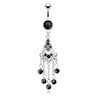 Veldig lekker navlepiercing i et veldig detaljert samt unikt design. Denne navlepiercingen er laget av kirurgisk stål og har en vanlig blank toppkule samt en stor rund svart sten som bunnkule. De svarte stenene er et tema som fortsetter nede i anhenget, hvor de sitter som dekorasjon i de flotte utskjæringer, på den øverste delen av anhenget.