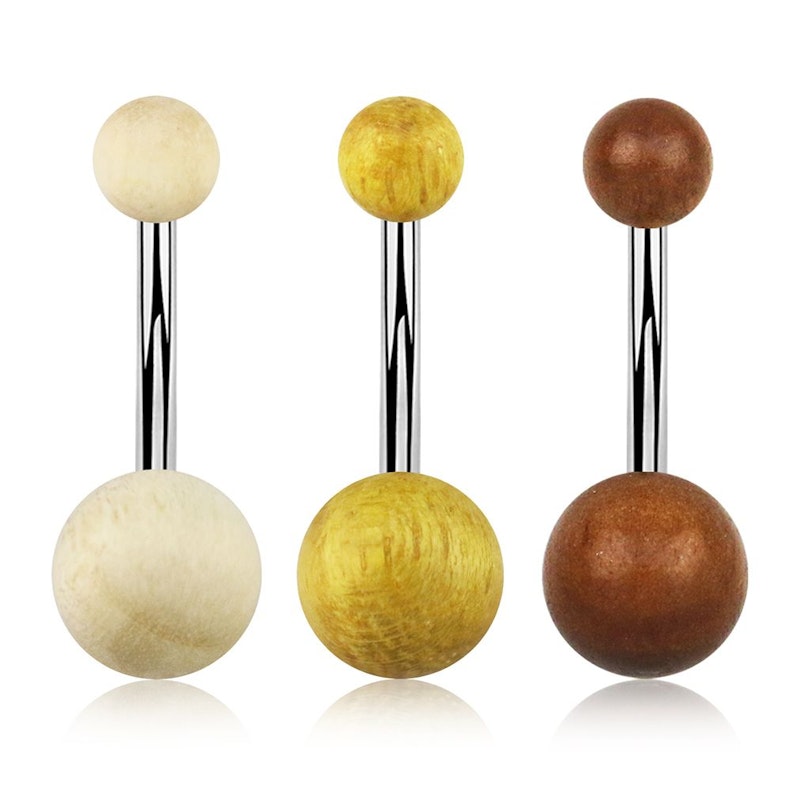 Du ser sjelden smykker laget av tre. Når du ser dem, er det nesten bare til bruk i øret. Imidlertid er dette smykket ikke 100% laget av tre, da staven er laget av kirurgisk stål. Men staven er gjemt i navlen, så du kan bare se kulene.