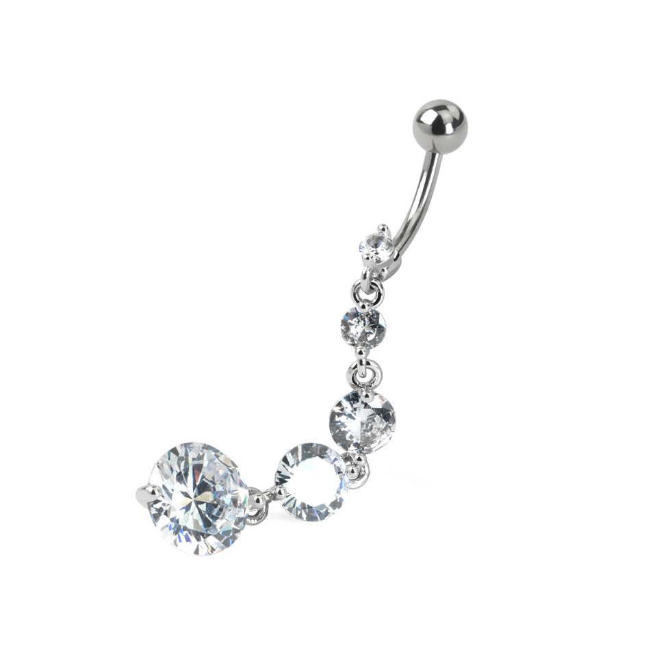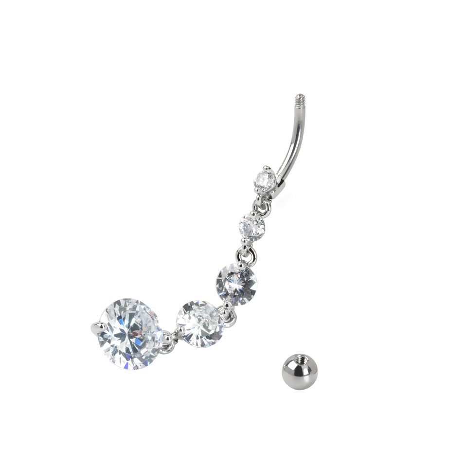 Navlepiercingens stav er 10 mm. lang og er laget av det sikre og mest vanlige smykkematerialet kirurgisk stål. På toppen av staven sitter en helt vanlig toppkule. I bunnen av staven har vi det lange flotte anhenget, hvor du selv bestemmer fargen på stenene.