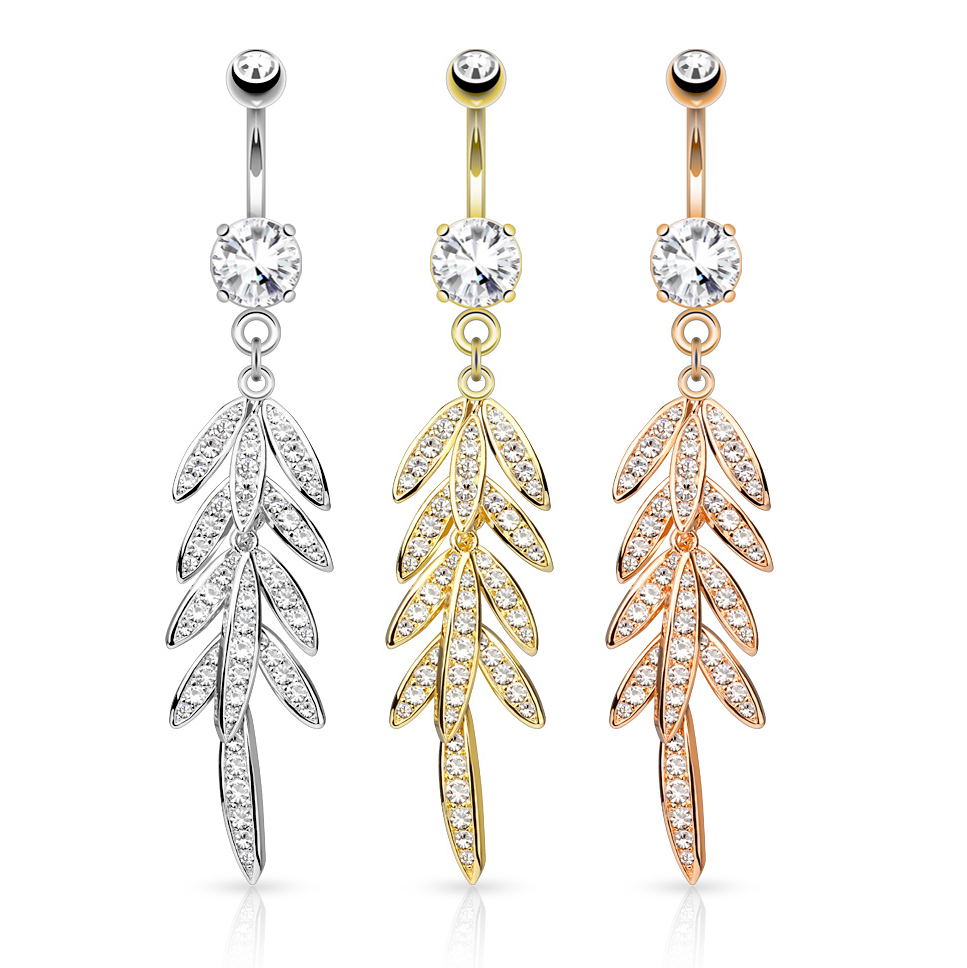Pent og elegant smykke til navlen, hvor det i anhenget sitter en lang rekke av små blader, hvor hvert sett kan bevege seg fritt pga. leddene som sitter på hvert sett blader. Alle bladene er vakkert dekorert med små klare stener. I alt er det langt over 50 små funklende stener, som alle gir et flott spill når smykket bæres og bladene dingler fra side til side.