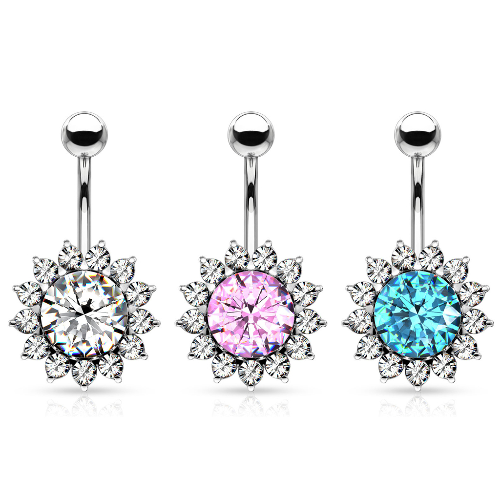 Denne navlepiercing har en stor flott og sten i midten som fanger lyset utroligt godt. Rundt denne store stenen er det hele veien rundt mindre stener som former et bladlignende design.
