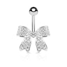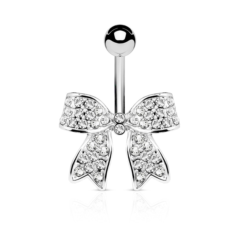 Her ser du en av de mer feminine navlepiercingene. Denne navlepiercingen er laget av kirurgisk stål, med messing foran. Messingfronten har blitt formet som en sløyfe, der mange små stener er blitt plassert på sløyfe. Midt på navlepiercingen er to store stener. Du kan velge mellom flere forskjellige farger på sløyfen. Stenfargen er den samme på alle modeller, noe som er tydelig - bortsett fra den blanke modellen, hvor du kan velge mellom to forskjellige stenfarger.