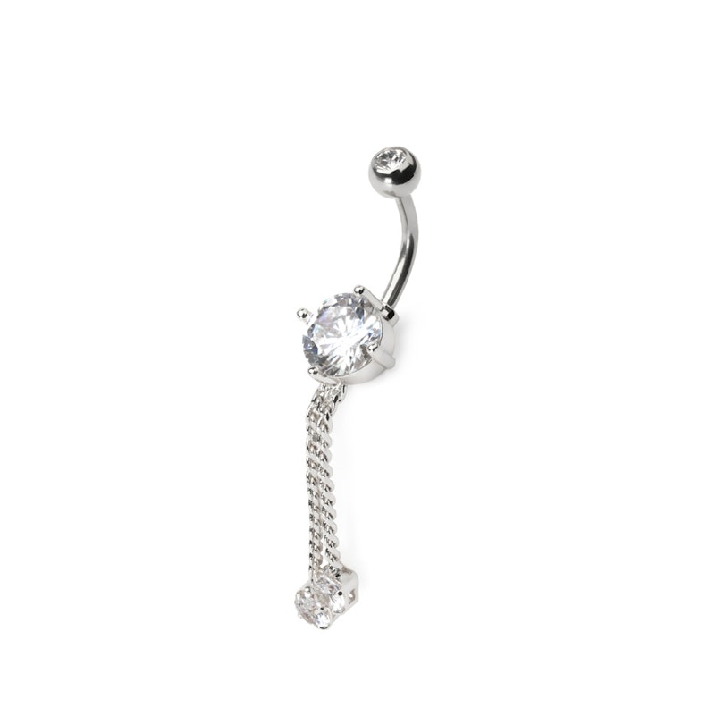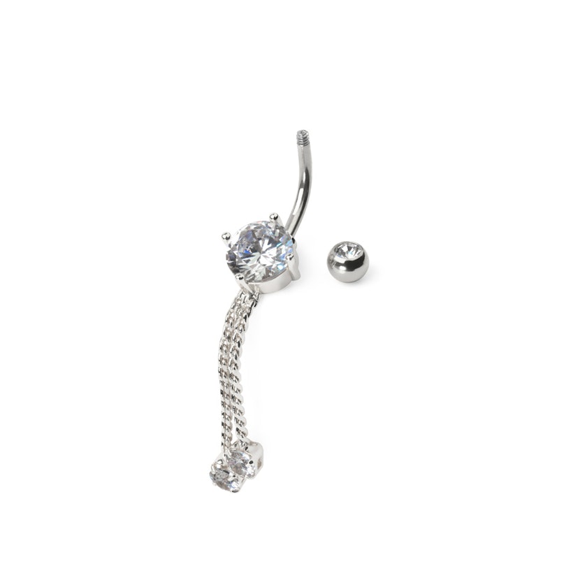Denne vakre navlepiercingen er et ekte statement-smykke. Når kjeden med små stener dingler, får den et snev av eleganse og bevegelse, noe som gjør denne piercingen helt unik. Det faktum at den er laget av kirurgisk stål, sikrer holdbarheten og komfort. Staven er 10 mm lang med en gjengetykkelse på 1,6 mm. Kjedene henger ned fra den 28 mm fra stenen. Tilgjengelig i et utvalg av gull-, sølv- og med rosegullfinish på de klare stenene. Denne navlepiercingen er det perfekte tilbehøret hvis du ønsker å legge til en gnist i påkledningen din.