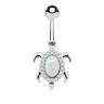 Er du gal etter alle havets dyr, skilpadder inkludert? Da har vi den perfekte navlepiercingen for deg. Denne navlepiercingen er laget av kirurgisk stål med messing i forsiden. Forsiden av dette smykket er laget slik at det ser ut som en skilpadde. Skilpadden har to små, svarte stener på hodet, som antas å være øynene. På skilpaddeens skjold ligger en stor syntetisk opalsten i midten. Denne opalstenen er omgitt av mange små klare stener. Selv om opalen er kunstig laget, går den ikke ut over utseendet til stenen - den er fortsatt like vakker som den var en ekte opalsten.