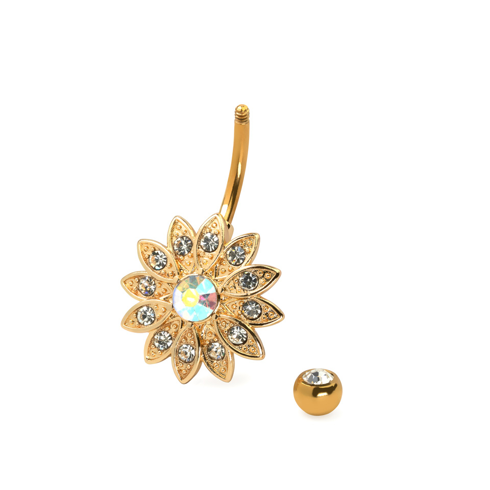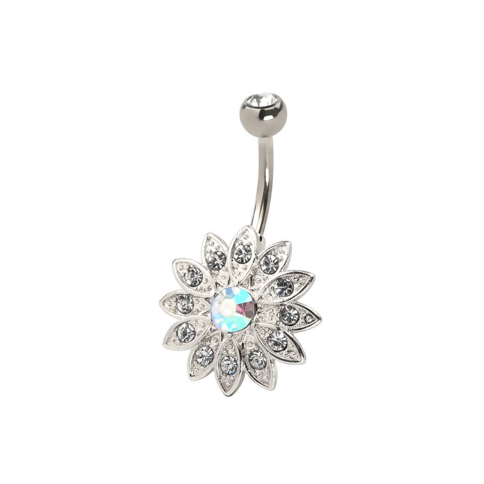 Blomsten består i all beskjedenhet av hele 12 avlange blomsterblader, som hver er dekorert med en skinnende vakker klar sten. De mange stenene glitrer og funkler når smykket beveges, og lyset fanges og reflekteres i alle stenene. Det ser helt fantastisk flott ut når navlepiercingen er i bruk, hvor smykket vil være i bevegelse. De mange blomsterbladene sitter helt tett i to lag, så blomsten ser både fyldig og frodig ut med sitt overdådige design.