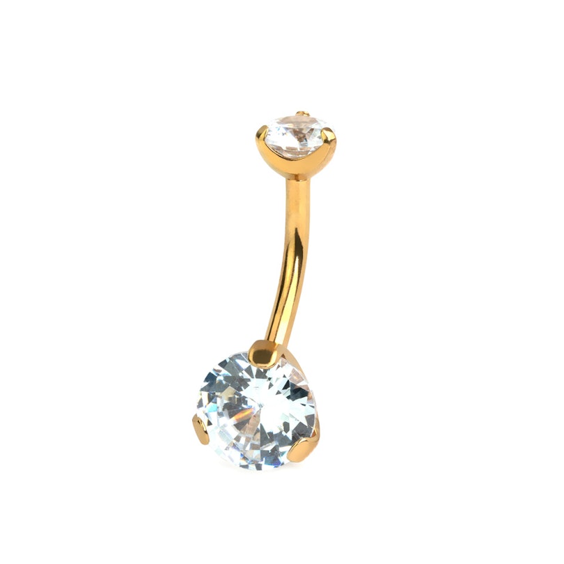 Hvis du elsker store klare stener i dine piercingsmykker har du kommet til det helt rette sted. På bildet lengre opp finner du nemlig en navlepiercing laget av kirurgisk stål som er belagt med forskjellige farger. I både topp- og bunnkulen sitter det en stor fasettskåret klar sten, som får smykket til å glitre og skinne når lyset treffer stenene. Rundt hver sten sitter det noen små fangarmer som er laget av det samme materialet som resten av smykket. Disse holder stenene på plass.