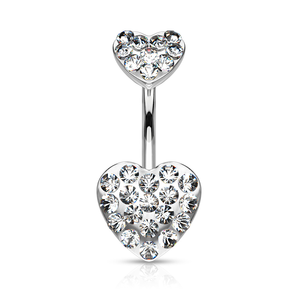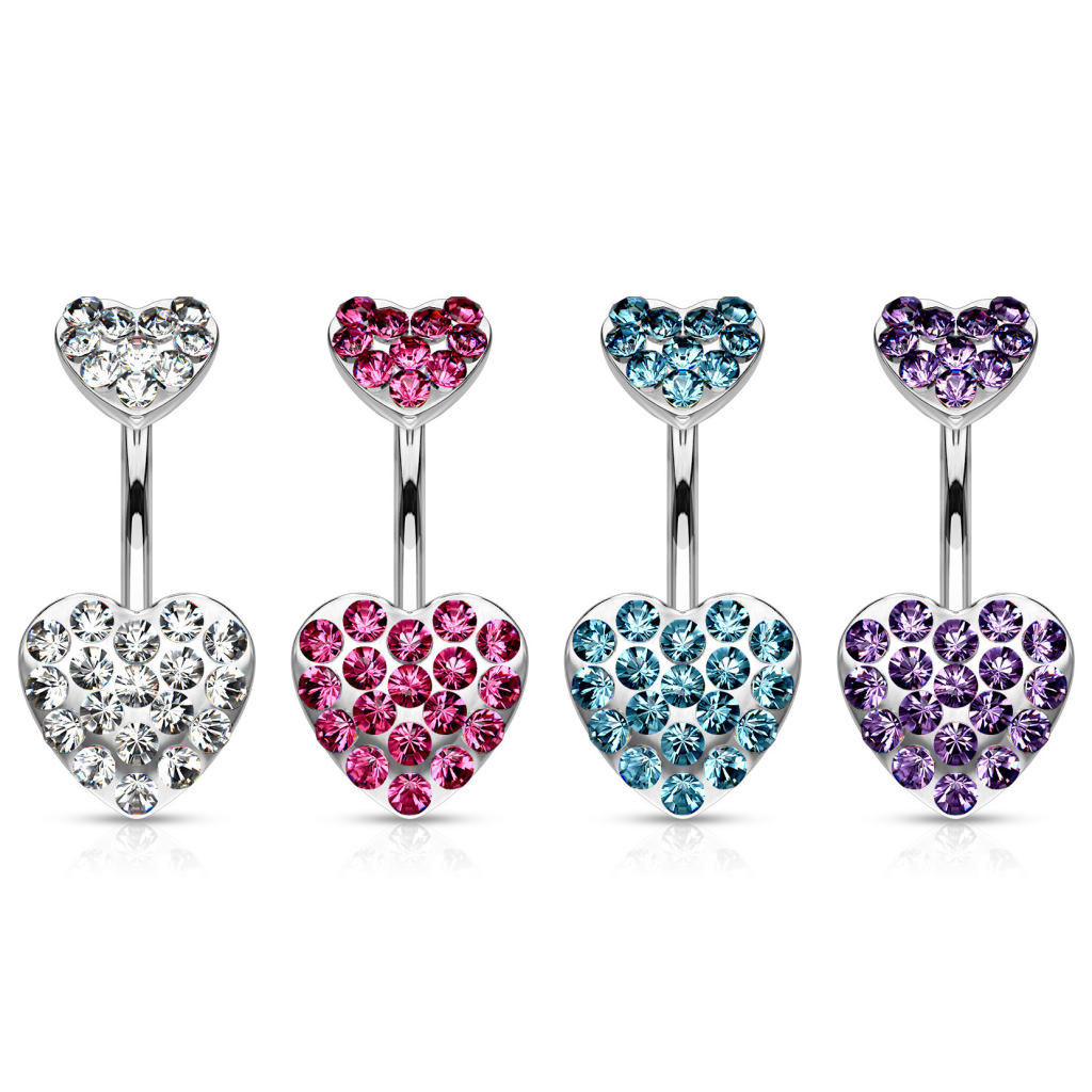 Smykket her er laget av kirurgisk stål og har en 10 mm. lang stav. Men i stedet for en vanlig topp- og bunnkule, er det brukt to søte hjerter som er så tett besatt med stener at det faktisk er det eneste man kan se. De mange små stenene er alle fasettskårt, hvilket gjør at de reflekterer lyset fra alle vinklene og derfor skinner og glittrer ekstra mye. Du kan velge mellom hele fem friske stenfarger til dine hjerter i denne navlepiercingen, alle er like flotte men det er sikkert en som faller mer i smak enn de andre.