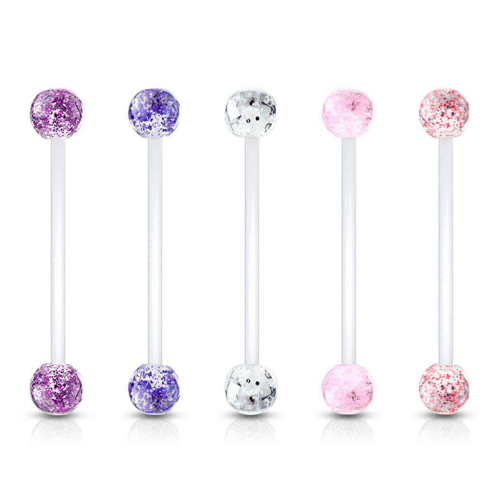 I hver ende av smykket er en vakker kule laget av akryl. Kulene er dekorert med et vakkert glittermønster. Kulene måler 6 mm. i kulestørrelse, og de kan velges i flere farger. Du kan få dine nye smykker med blå glitterkuler, eller med klare glitterkuler.