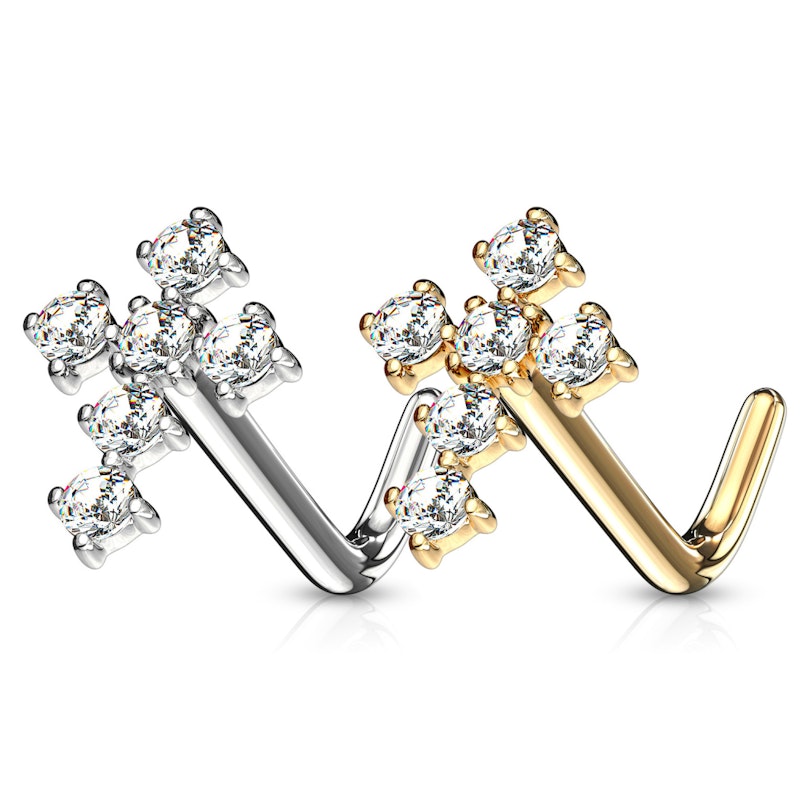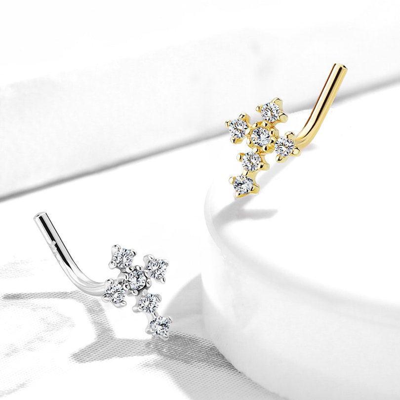 Denne nesepiercing må sies å være noe helt spektakulært fra topp til bunn. Fra den flotte fargen på L-formede staven til det glitrende korset på fronten. Du har nemlig klikket deg inn på en nesepiercing som er laget av 14 karat gull, så smykket er på toppen av det hele laget av et ordentlig kvalitetsmateriale. Du kan få smykket i flere materialer, blant annet vanlig 14 karat gull, men også en variant av elegant 14 karat hvitt gull. Smykket er utstyrt med et lite knekk på 90 grader, hvilket er en fordel når du har smykket i. Knekket forsikrer nemlig at smykket ikke faller ut - samtidig som det er litt mer behagelig å sette smykket i, fremfor en helt rett nesestav som har en bakdel.