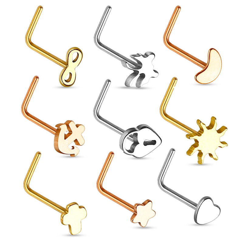Denne nesepiercingen finnes med flere forskjellige slags motiver. Velg bl.a. mellom et uendelighedstegn, et anker eller et flott kors. Valget er ditt og det er det også når det kommer til fargen. Alle motivene kan velges i tre farger, som er henholdsvis blank, gull og rosegull.