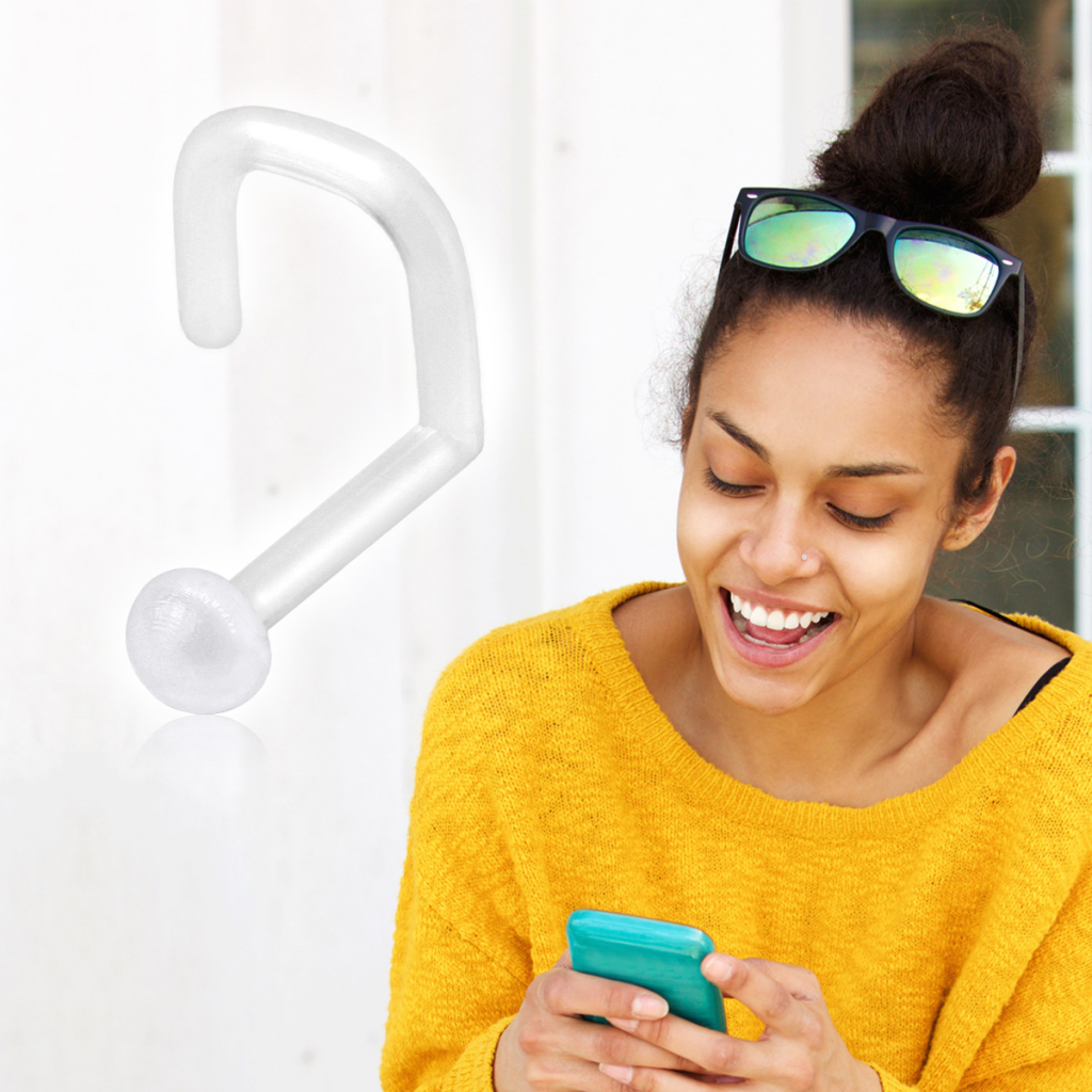 Denne nesepiercing-skjuleren er laget av PTFE. De har også kallenavnet "retainer" og er gjennomsiktige, noe som gjør det velegnet som et "arbeidssmykke" - et smykke du tar inn hvis det ikke er bra å ha piercinger på jobben, på skolen eller ved bestemorens salongbord.